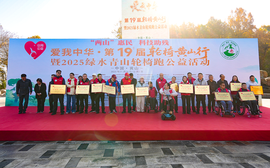 当阳光穿透黄山的云海,洒在花岗岩峰林之上,一群特殊的攀登者已在迎客松前留下了他们灿烂的笑容。2025年11月29日至30日,为期两天的“爱我中华·第十九届轮椅黄山行暨2025绿水青山轮椅跑”公益活动圆满举行。本届活动以“‘两山’惠民,科技助残”为主题,旨在让残疾人群体也能平等享受绿水青山的生态福祉,是科技与人文共助社会融合的生动实践。